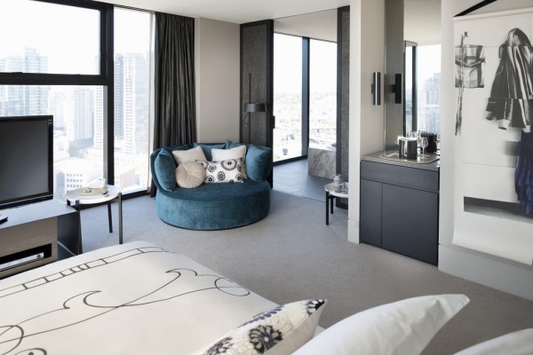 Located on levels 8-24, the Loft rooms showcase 80 square metres of wide open spaces and views of the bustling city below. They feature a modular lounge and dining table for up to four people, plus three LCD TVs. The bedroom features its own ensuite with deep soaking bath, double vanity and oversized shower.