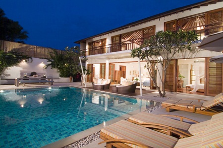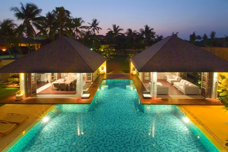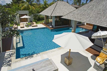 The fresh white walls and furnishings, the warm brown of the teak frames, and the cool aquamarine and cobalt blue of the ceramic pool tiles, form the dominant colours, juxtaposed against the greenery of Bali's exotic plants. The style is based on the concept of the traditional Balinese family compound with a separate building or bale for each function, in accordance with the comforts of modern living. Recessed lighting creates a romantic ambience at night.