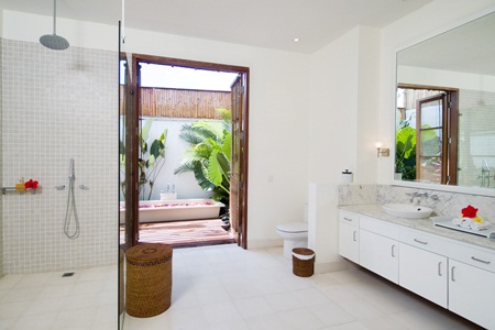 All four air-conditioned bedrooms, with their en-suite bathrooms and cream terrazzo floors, are the same size and shape; two are located downstairs and two are located upstairs, mirror images of each other in keeping with the perfect symmetry. Three of the bedrooms are furnished with king size beds with diaphanous white drapes. The fourth bedroom, upstairs, is fitted out as a children's room, designed to sleep four kids in bunk beds. Each bedroom is complemented by fitted white louvre wardrobes, white storage units and white curtains. Each en-suite bathroom is entered through an Asian-influenced sliding frosted-glass door, designed to let the light through. All of the bathrooms feature grey streaked marble topped vanity units, huge wall mirrors, ceramic washbowls, toilets, and sizeable glass shower cubicles with powerful rainshowers. One of the upstairs bathrooms features "his & hers" washbasins, while one of the downstairs bathrooms boasts a bathtub, bordered by mosaic tiles in shades of brown and beige. The doors from this downstairs bathroom open into a private walled garden area with an outdoor rainshower, complete with mosaic tiled splashback and washbasin.