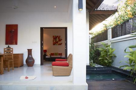 2 Bedroom Villa Mawar: Features lush gardens and relaxing Bale by the 4 x 2 metre freshwater pool with wide sun deck with sun lounges. These villas have en-suite indoor/outdoor Balinese bathrooms with marble vanities and freshwater showers. The spacious open-plan living area overlooks the garden and pool. Bedding is 2 Double Beds. Maximum room capacity is 5 Adults & Children.