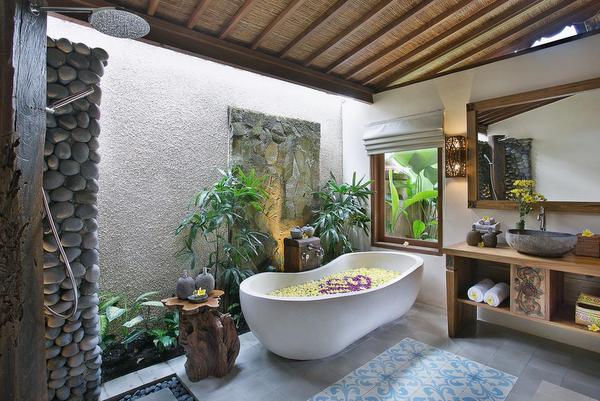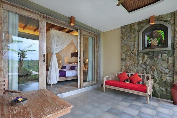 A wide stone pathway lined with native flora runs straight down the middle of the resort is inspired by "Tenganan" native Balinese village. Charming wooden Javanese ‘joglo’ villas flow off this central axis to emulate the look of a small but integrated community. It's a combination of European design with high decorative ceiling and the wide Javanese veranda.