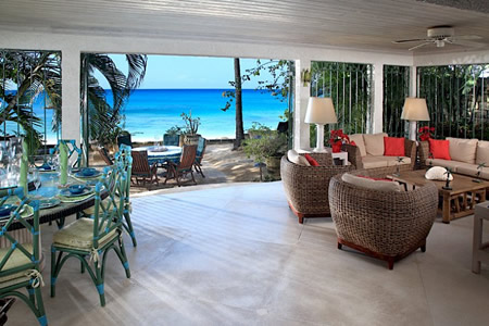 There are also two comfortable seating areas, a spacious dining room, and a beautiful terrace which opens up onto the beach.
