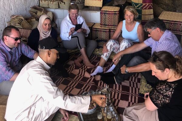 A scenic walk through olive groves and market gardens, starting at the region’s largest argan tree. Visit the mausoleum of Saint Sidi Bourahmoune, enjoy panoramic views of the oasis and spring, watch traditional argan millstone carving, and finish with a basket-weaving demonstration and a cup of local tea – email Barbara