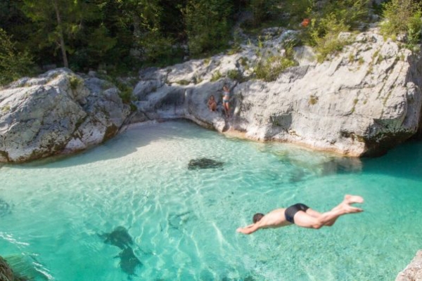 While the river offers various swimming spots, the boldest adventurers must try cliff jumping at Velika korita. Located at the Great Soca Gorge’s end, it offers tranquil emerald pools where rapids calm down. Among the well-known spots are the gravel areas between Kobarid and Tolmin, including the Tolminka and Soča rivers’ confluence in Tolmin, hosting various festivals.