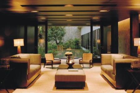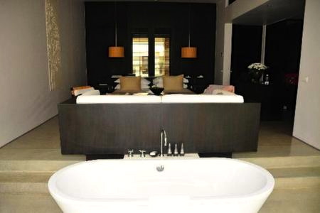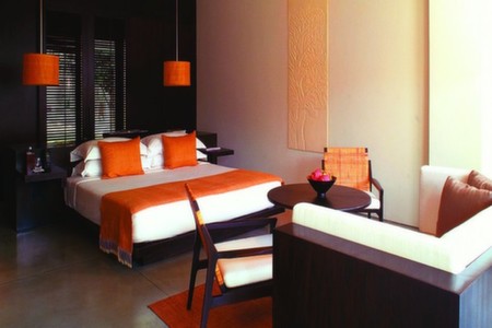 The combined sleeping and living area has a large writing desk and a king-size bed. Adjacent is a dressing area with hanging cupboards and drawers, a large sofa and an informal dining table and chairs. Beyond, and leading down a few steps is the bathroom with floor-to-ceiling glass doors which open onto a light-filled garden featuring a cushioned banquette. The bathroom contains twin vanities with makeup mirrors, a large soaking tub and a separate shower and toilet. Each suite is air-conditioned and offers Internet connections, ceiling fans, a telephone, room safe and music system.