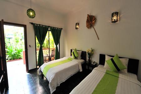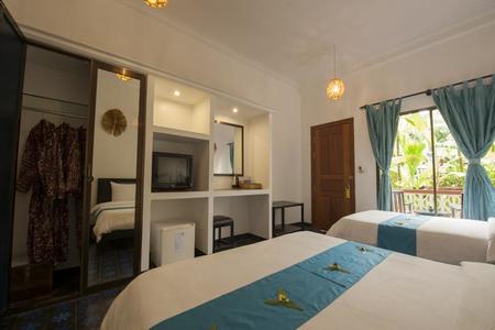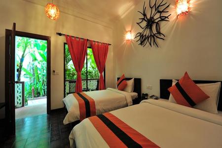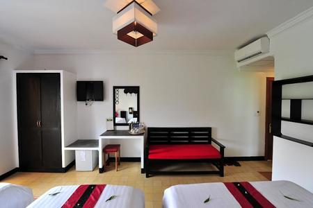 Deluxe Double & Twin, with Pool views. Deluxe Triple offer either rooms with one queen size bed and one single bed or rooms with three separate single beds. The deluxe Family room is suitable for a family with two children. This type of room consist of one king size bed for parent and two single beds for children. There are two family rooms available, one with pool view and another one is garden view in the quiet location, including a private balcony or terrace. Deluxe Interconnecting Rooms (one double room connected with one twin bed room) are ideal for families or groups. All rooms offer A/C, WIFI, Laundry Service, Satellite TV, Private Balcony and Breakfast.