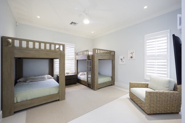 Bedrooms four and five are both garden view. Bedroom four has two twin beds that can be converted to a king bed. The en suite bathroom has a shower-tub combo. Bedroom five has four full bunk beds. On the upper level of the carriage house sit bedrooms six and seven. Both are en suite with a tub-shower combo, have garden views, a king bed, small balcony, and kitchenettes with a breakfast table. All bedrooms are equipped with Apple TV.