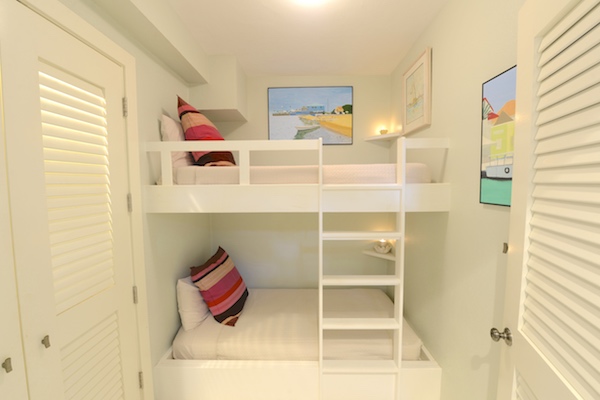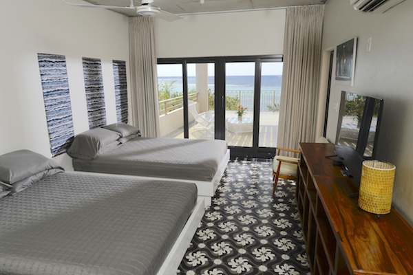 The ground floor bedroom has a partial ocean and garden view and is accessed from the pool deck. The en-suite bathroom has a walk-in shower and dual sinks. The room has one king bed and an adjacent alcove has a set of large twin bunk beds. There are two garden view bedrooms one level up. One has two single Murphy beds, Apple TV, DVD player, and an X-Box gaming system. The other has one queen bed and an en-suite bathroom with a tub/shower combo and dual sinks. An additional door makes this bathroom accessible from the hallway. On the top floor sit two ocean view bedrooms with access to a shared balcony. The master suite has an open plan bed/bath room with a king bed, an open plan walk-in shower inside and an exterior deep soaking tub with a shower, dual sinks, and a private water closet. The fifth bedroom has two queen beds, direct access to the master bathroom, Apple TV, and an independent air conditioning unit.