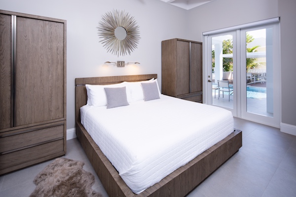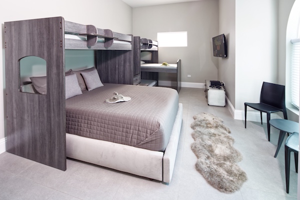 All bedrooms are en suite and an additional half bath sits off the game room. Bedroom one is a master suite with direct access onto the pool and a beautiful ocean view. It boasts a king bed, mini fridge, espresso maker, an oversize walk-in closet, dual sinks, deep soaking tub, and rainforest shower. A second master suite sits at the opposite end of the house, also providing an ocean view and direct access to the pool and outdoor fire feature. The en suite bath has a shower, soaking tub, and dual sinks. A smaller bedroom with king bed has a pool view and sliding doors opening to the pool deck. Two bedrooms have garden views, one with a king and the other a queen bed. The en suite bath to the queen-bedded room has a shower-tub combo while the king-bedded room has a shower. The sixth bedroom can sleep six in a unique configuration of bunk beds with a queen bed and three single beds. The upper bunks are reached by stairs, not a ladder. All bedrooms are equipped with Apple TV and Sonos sound system.