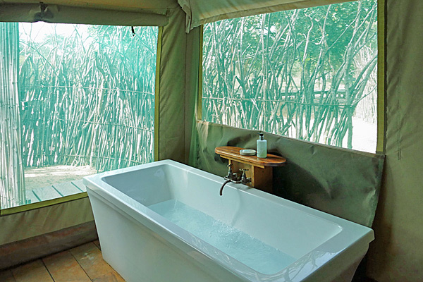 The luxury safari tents are on a raised platform with wooden floors, a four-poster bed with mosquito net, ensuite facilities including a bath and outdoor shower and a small terrace. The animals in the reserve are free to wander right up to the tents should they wish to.