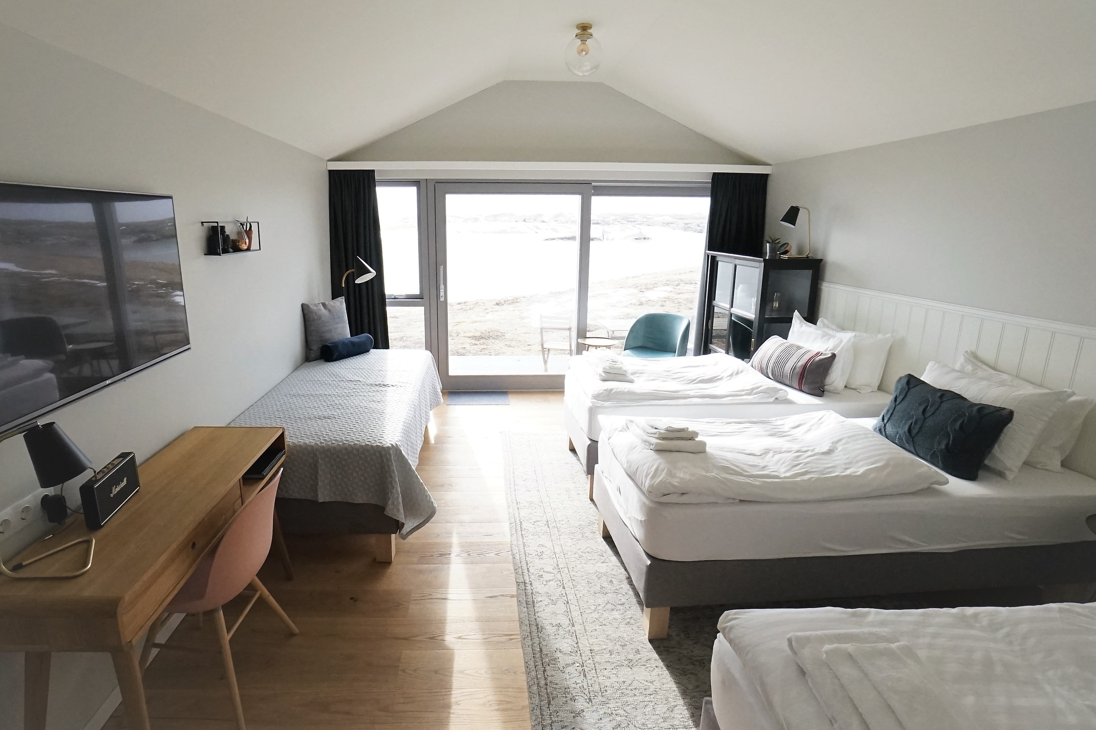 rooms back onto the lake, rich with birdlife, moss covered lava fields, black sand glacial river and the imposing volcanoes and Vatnajokull in the distance. Great Northern Lights location – terraces attached to rooms on edge of lake. Choose from standard double or twin, deluxe double or a family room. All rooms have an en-suite bathroom, terrace and flat-screen tv.