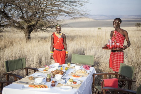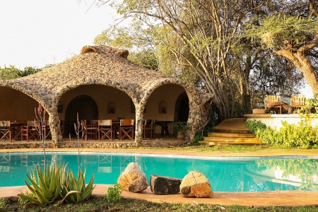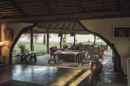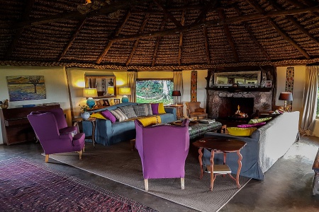 Breakfast or lunch is often served on the lawns of the beautiful gardens of the main house, where a swimming pool looks out onto the waterhole, where animals can often be seen drinking and bathing. The main communal area consists of a large building with an open fireplace, where guests can relax and enjoy a drink before the evening meal. Guests have dinner at a large family dining table located in the same building, where they are served by the owners of the conservancy, Calum and Sophie Macfarlane. Leading off from this building is a large shaded veranda, which offers guests the perfect spot to sit and enjoy a drink as they watch the sun set.