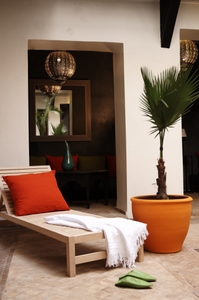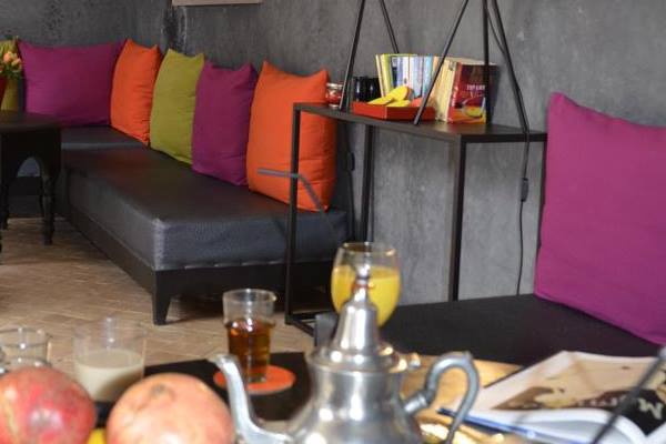 There are plenty of places to relax with a book, play games, catch up on emails or enjoy a drink. The winter lounge has a fireplace, dining and seating area. The roof terrace has a panoramic view over Marrakech and the Mountains, and offers sun beds, a open air shower and comfortable dining and seating areas. It is the perfect place to relax, sunbathe or enjoy a meal. The main courtyard is light and uncluttered with a pool. The cool and colourful summer lounge is also a great place to relax.