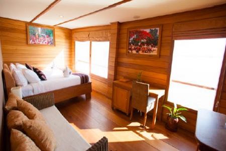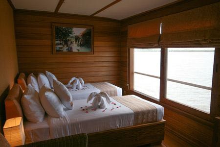 The cabins are tastefully appointed with teak wood panelling and floor boards, and large, comfortable beds. The real selling point of this boat is the large floor to ceiling windows that offer wonderful views of life from the river as you slowly make your journey up or down the Ayeyarwaddy River. All cabins are fitted with modern comforts, including en suite bathrooms and hot and cold showers and electricity is provided 24 hours a day.