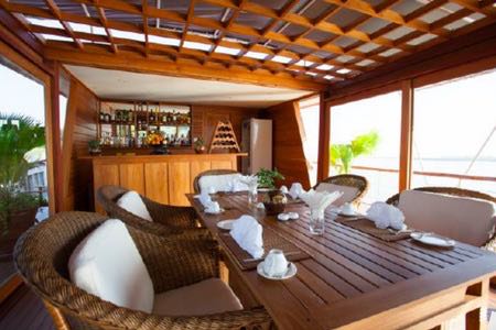 The boat is finished in smart teak wood and has large, ample space on deck. The boat has a beautiful sun lounger platform with large cushions over a decking area, as well as tables and chairs on deck so you can enjoy your lunches and evening dinners with the river breeze in your hair. There is also a smart indoor area with a bar and dining room table.