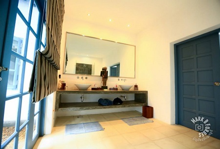 The living space is comprised of a fully-equipped kitchen and open plan lounge, with double doors leading out on to the courtyard, pool deck and outside dining area. The lounge and pool side are fitted with surround sound speakers, a flat screen HD TV (for DVDs only), DVD player/library and complimentary WIFI. There is also a selection of books and board games for guests to enjoy.