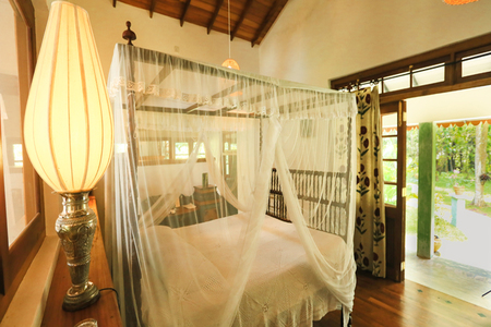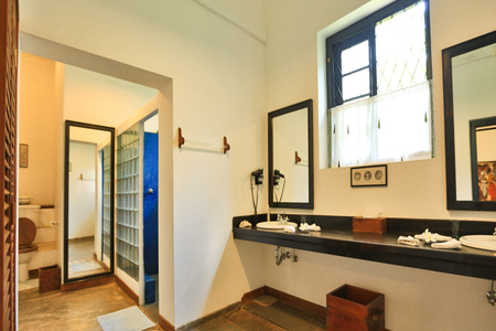 In the main house on the first floor is a large air-conditioned master bedroom with high ceilings. It is furnished with antique furniture including a carved king-size four poster bed and has an en-suite bathroom. There is a large verandah which overlooks the swimming pool.