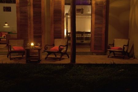 On the inside each villa has two air-conditioned double bedrooms with antique four poster beds. Spacious en-suite bathrooms with a bathtub and open air shower. A comfortable living and dining area with a table that can seat six people. A further two children can also be accommodated in the living area if necessary. Wide verandahs with planters' chairs lead out onto a walled garden. The kitchen is fully equipped and includes a mini-bar.