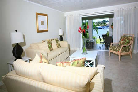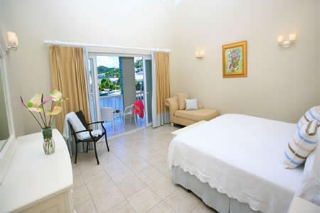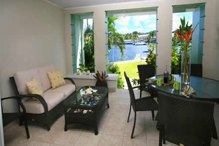 The room is cooled by central airconditioning and it opens out through French doors onto an oceanfront patio. The view from the patio is of the Rodney Bay Marina with its beautiful array of luxury yacths and sailboats. There is a well equipped kitchen and laundry room for your convenience and a small powder room.