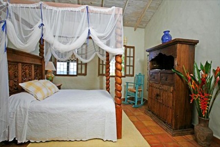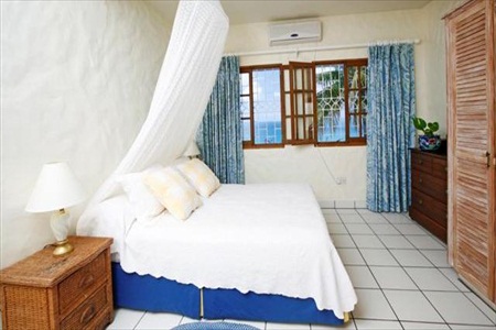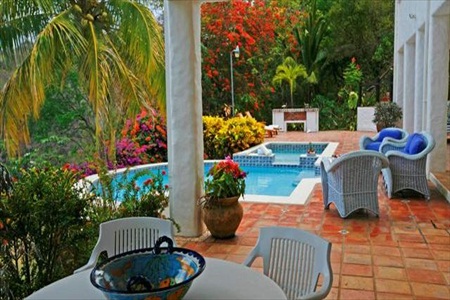 The House: You enter the villa through antique Mexican doors into a courtyard, with beautiful terra cotta tiles and a lush garden. The top floor consists of the following:-large master bedroom with king size bed and en suite shower room, bedroom 2 with ceiling fan and a queen size four poster bed and en suite shower room, a large sitting/dining room with Cablevision TV and CD and cassette stereo, which leads onto a spacious patio enjoying a spectacular sea view. There is also large, well equipped kitchen.