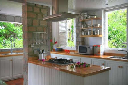 The large living room is fully furnished with comfortable chairs upholstered in a cool white fabric, a wide screen TV ( no TV reception available in the area), DVD player and DVD library. The 3rd bdrm is located lower down the pool and deck area. This bedroom enjoys a panoramic view of the pitons and the sea as the front wall of this bedroom opens out completely to enjoy the view. This bedroom has a ceiling fan for additional comfort and is completed with its own ensuite bathroom. There is a separate dining area with an outside balcony with a breakfast table. The kitchen is well equipped with a counter top hob, under the counter stove, fridge, freezer, ice machine, microwave, dishwasher and most appliances. There is a separate kitchen deck which accommodates a charcoal barbeque and gas burner.