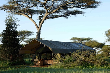 Although there are boundaries for the Serengeti park, the ecosystem goes way beyond these limits, and is called the Greater Serengeti. It's a giant picture of wild Tanzania with masses of animals, contrasting land forms, and tribal peoples. The Serengeti Safari Camp roams around the lot in true nomad fashion. This camp is semi-nomadic - it won't move whilst you're there - but its actually on a wide orbit shadowing the migration; so you, your Tanzanian driver-guide and private 4WD vehicle are as close to a million wildebeest as possible. While you can head off from dawn till dusk on your own adventures, the small wandering camp is sociable because its shared - with guests staying in classic bush style.