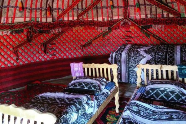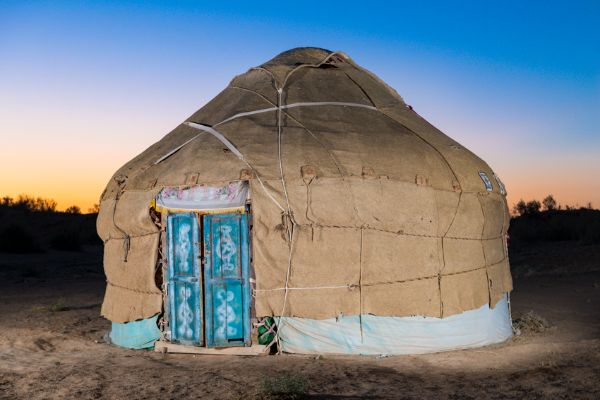 This basic yurt camp is located among the sand dunes in the Kyzylkum Desert, around six miles from Aydarkul Lake. There are 26 yurts here, each decorated with handmade carpets and felt rugs, known as sherdaks; and inside there is a real colourful collection of craftmanship adding to the beautiful lattice design of the yurt’s structure.